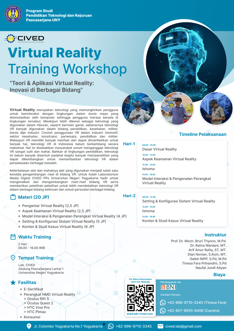 - Pelatihan dan Workshop Pembelajaran Hybrid dan Immersive: Menyelenggarakan pelatihan terstruktur terkait konsep, desain, dan aplikasi pembelajaran hybrid dan immersive berbasis Virtual Reality untuk pendidikan tinggi, vokasi, dan pelatihan profesional.