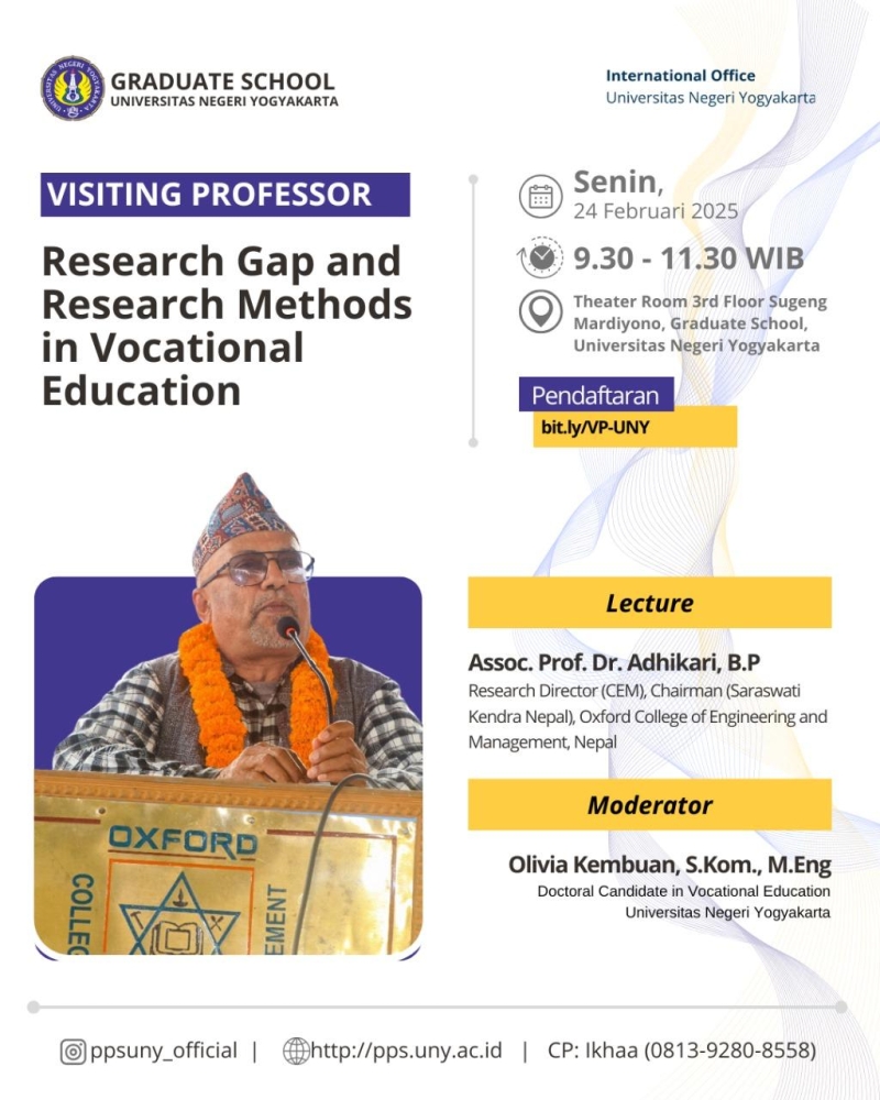 Kuliah tamu oleh Assoc. Prof. Dr. Adhikari membahas pentingnya identifikasi research gap dan penerapan metode penelitian dalam pengembangan pendidikan vokasional.